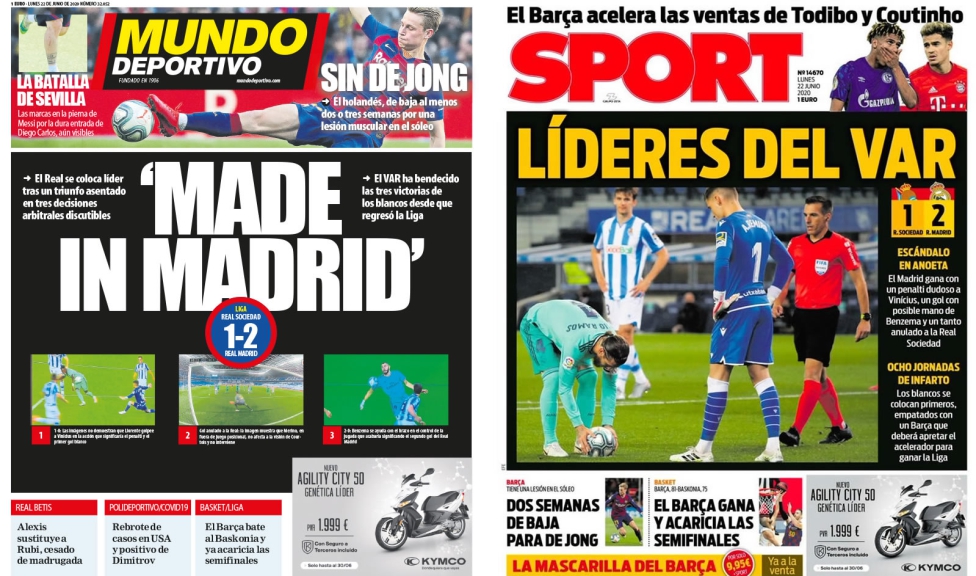 สื่อบาร์เซโลน่าร่วมกันพาดหัวแซะ เรอัล มาดริด เรื่องการตัดสินของกรรมการ หลังเกมที่ทีมของซีเนอดีน ซีดาน บุกไปเอาชนะเรอัล โซเซียดาด และขยับแซงเป็นจ่าฝูงลาลีก้า